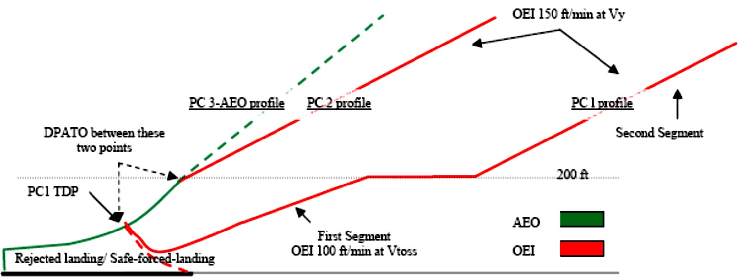 It could be argued that the essential requirement for DPATO is contained in section (d)(2) — OEI obstacle clearance. From careful examination of the flight path reproduced in Figure 3 above, it may be reasonably deduced that DPATO is the point at which adequate climb performance is established (examination of Category A procedures would indicate that this could be (in terms of mass, speed and height above the take-off surface) the conditions at the start of the first or second segments — or any point between.)