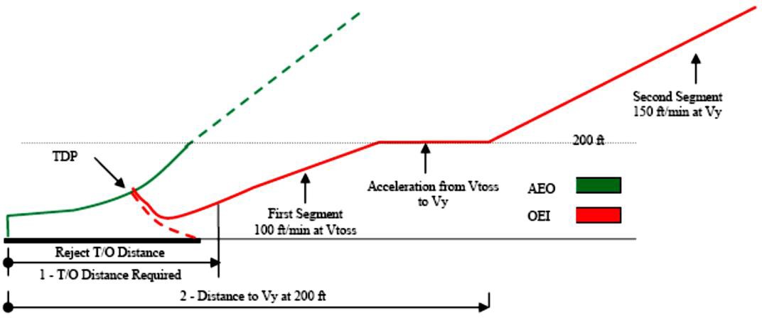- — Performance class 1 (PC1): from TDP, requires OEI obstacle clearance in all phases of flight; the construction of Category A procedures, provides for a flight path to the first climb segment, a level acceleration segment to Vy (which may be shown concurrent with the first segment), followed by the second climb segment from Vy at 200 ft (see Figure 1).