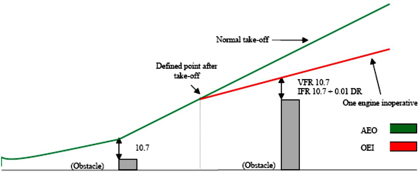 obstacles can be cleared (or avoided) — AEO in the take-off phase and OEI in the climb.