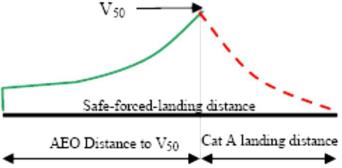 From Figure 10, it can be seen that if the Category B V50 procedure is used to establish DPATO, the combination of the distance to 50 ft and the Category A ‘clear area’ landing distance, required by CS/JAR 29.81 (the horizontal distance required to land and come to a complete stop from a point 50 ft above the landing surface), will give a good indication of the maximum safe-forced-landing distance required (see also the explanation on Vstayup above).
